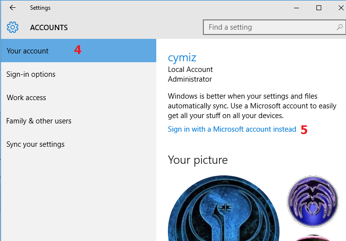 5. จะเกิดหน้าต่าง ACCOUNTS ขึ้น ทำการคลิกเลือก รายการ Sign in with a local account instead