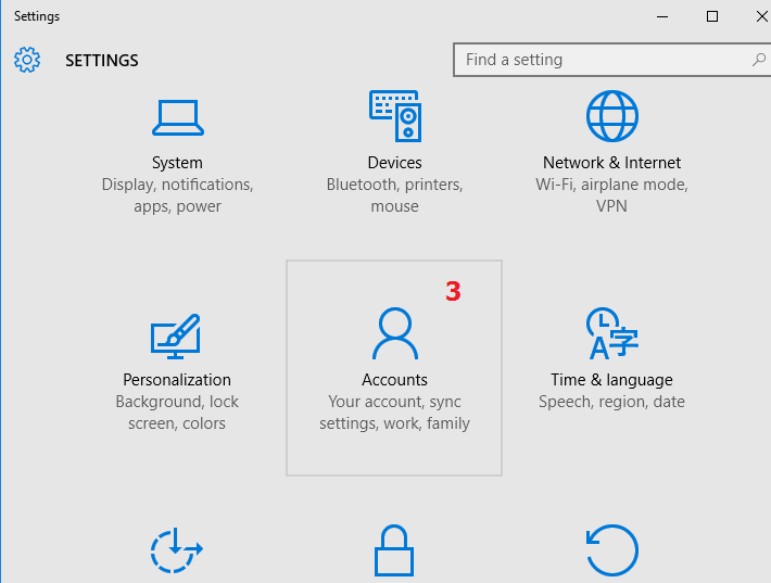 1. เปิด “Settings Account” โดยไปที่ Start > Settings > Accounts หรือ Start แล้วคลิกที่ User จากนั้นเลือกที่ Change account settings