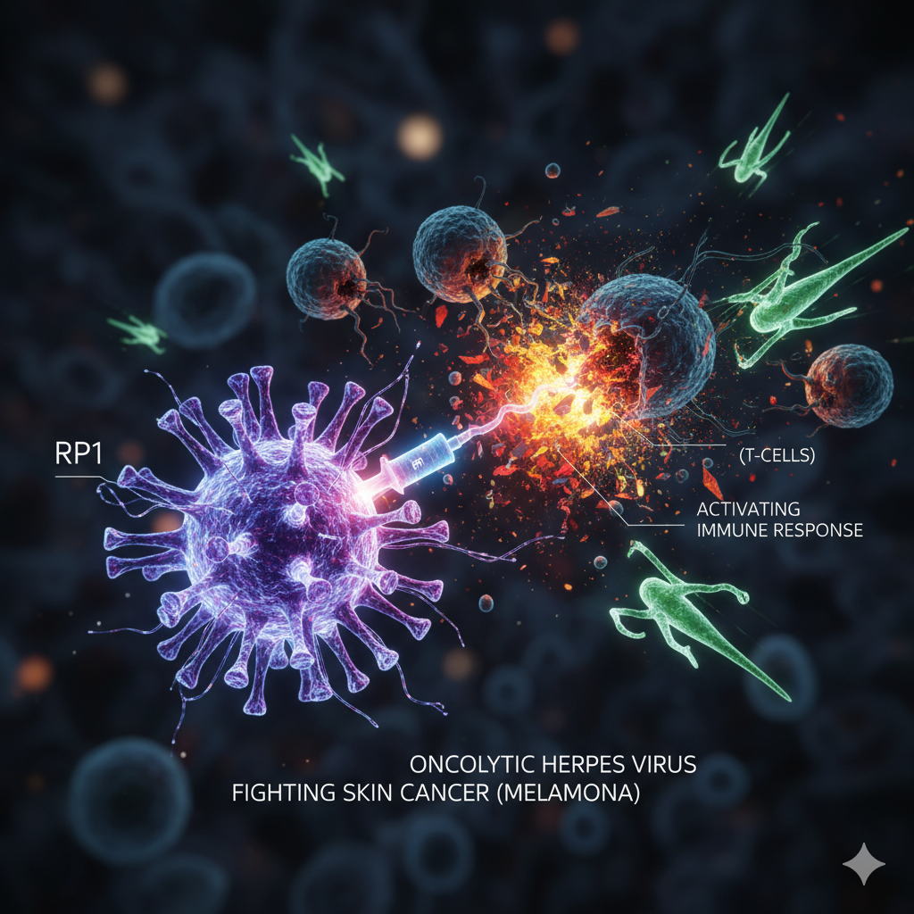 A close-up, stylized, and modern graphic showing a microscopic view. The main subject is a modified Herpes Simplex Virus (HSV-1), labeled “RP1”, shown in vibrant purple/blue. This virus is attacking a cluster of abnormally dividing skin cancer cells (melanoma), depicted in dark red or black.